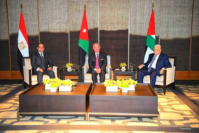 شدد الملك الأردني الملك عبد الله الثاني، والرئيس المصري عبد الفتاح السيسي، والرئيس الفلسطيني محمود عباس يوم الأربعاء على أهمية الضغط المستمر لوقف العدوان الإسرائيلي على غزة، وتحقيق حماية للمدنيين العزل، مع التمسك بالتوجيه نحو حل دولتين لقضية الفلسطين على أساس حل الدولتين.