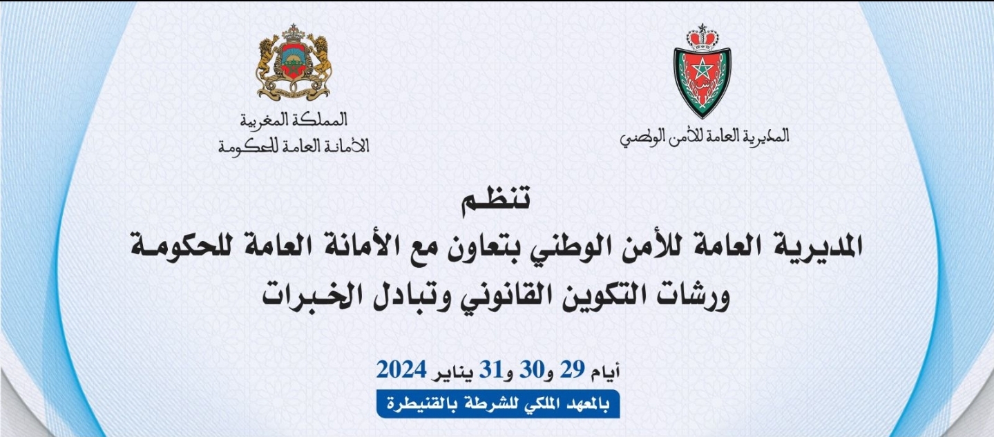 بشراكة بين المديرية العامة للأمن الوطني والأمانة العامة للحكومة، يحتضن المعهد الملكي للشرطة بمدينة القنيطرة، اليوم الاثنين 29 يناير الجاري وعلى مدى ثلاثة أيام، برنامج ورشات للتكوين وتبادل الخبرات حول موضوع “الممارسات الفضلى في مجال آليات صياغة النصوص القانونية”.