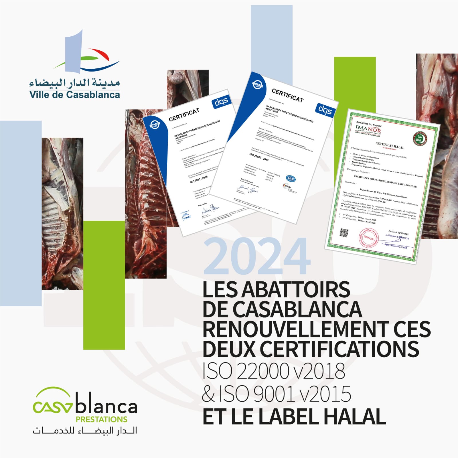 تمكنت مجازر الدار البيضاء مرة أخرى من نيل شهادة الجودة ISO 22000 v2018 ، وشهادة الجودة ISO 9001 v2015وكذا علامة “حلال”، ويترجم هذا التتويج المزدوج الالتزام المتواصل لمجازر الدار البيضاء بالحفاظ على معايير عالية من الجودة والنظافة في عمليات الذبح وتحويل اللحوم الحمراء.