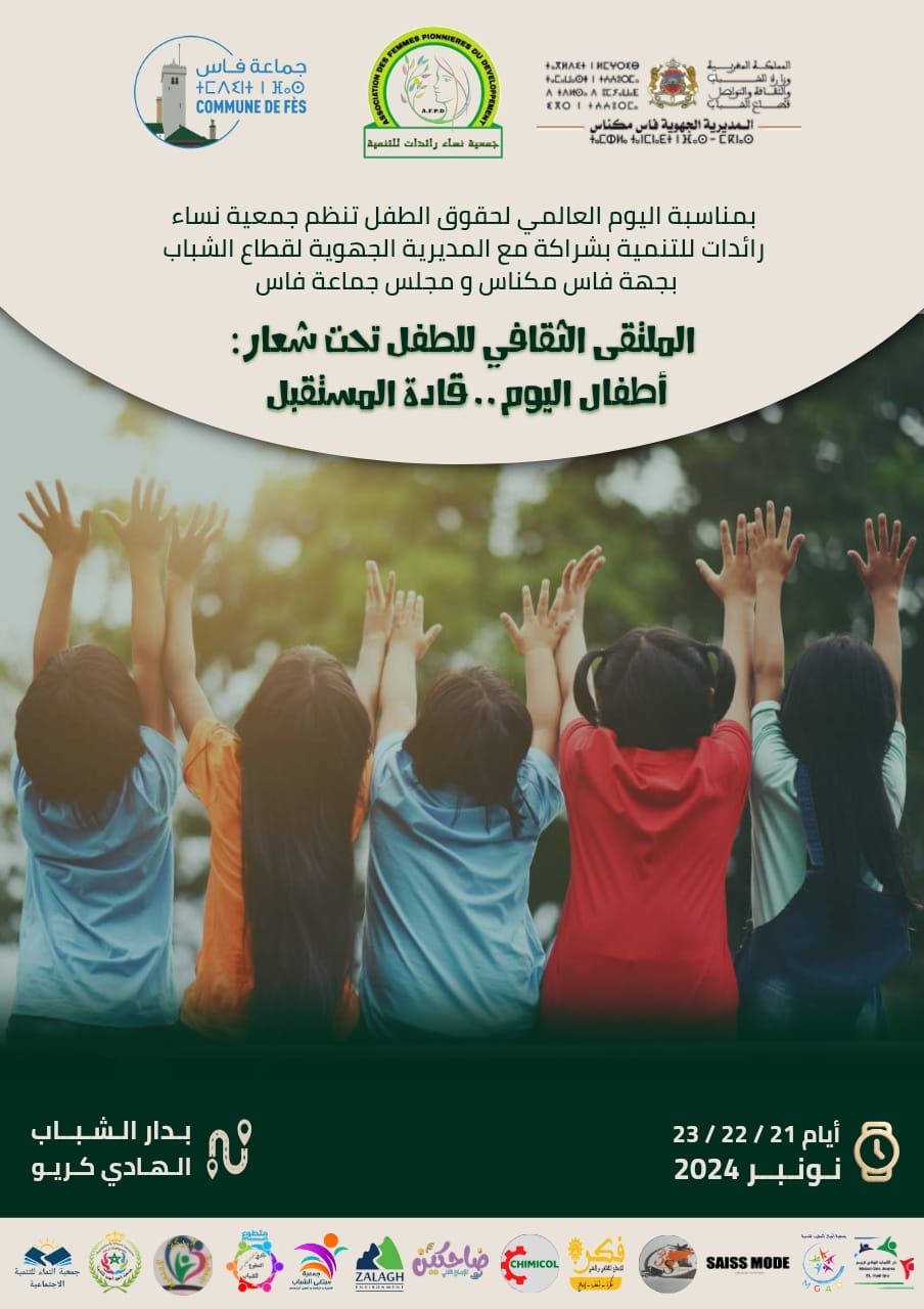 أعلنت جمعية نساء رائدات للتنمية عن تنظيم النسخة الأولى من الملتقى الثقافي للطفل 2024، الذي سيُقام خلال أيام 21 و22 و23 نونبر 2024، بمؤسسة دار الشباب الهادي كريو-زواغة. يهدف الملتقى إلى تعزيز الثقافة وتنمية الوعي لدى الأطفال، من خلال أنشطة متنوعة تجمع بين التدريب، الثقافة، والفنون.
