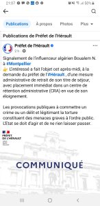 أعلنت محافظة هيرولت الفرنسية، عبر تغريدة على صفحتها الرسمية، عن اتخاذ إجراءات إدارية ضد المؤثر الجزائري “بو عْلام”، المعروف ب ” دوالمين” المقيم في مدينة مونبلييه. وأوضحت السلطات أن القرار صدر بناءً على طلب المحافظ، حيث تم سحب تصريح إقامته ووضعه فوراً في مركز احتجاز تمهيداً لترحيله.