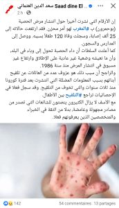 وأكد العثماني في تدوينته أن حالات الإصابة بلغت 25 ألف حالة، مع تسجيل 120 حالة وفاة بين الأطفال، مشيراً إلى أن المرض انتشر ليصل إلى المدارس وحتى السجون. واعتبر أن سبب هذا التفشي يعود إلى عزوف عدد من العائلات عن تلقيح أبنائهم، بسبب انتشار معلومات مضللة حول التلقيح عقب جائحة كورونا.