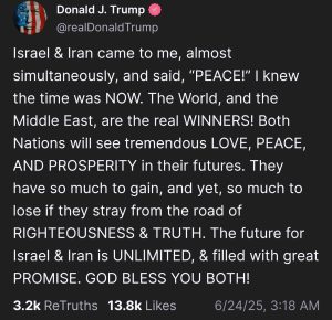 وأكد ترامب، عبر منشور على منصته “تروث سوشيال”، أن كلا البلدين تواصلا معه في التوقيت ذاته تقريباً طلباً للسلام، مضيفاً أن “العالم، والشرق الأوسط، هما الرابحان الحقيقيان!”.