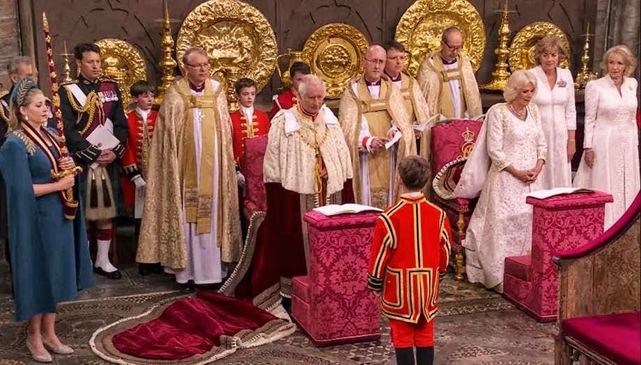 وانطلقت المراسم بموكب بالعربات تحت المطر من قصر باكنغهام إلى دير وستمنستر، حيث تم تتويج الملك وزوجته الملكة كاميلا من قبل رئيس أساقفة كانتربري جاستن ويلبي في حفل طقوسي على الطريقة الانجليكانية وقبل ذلك بوقت قصير، أدى الملك اليمين بأداء خدمته لرعاياه وحماية كنيسة إنكلترا.